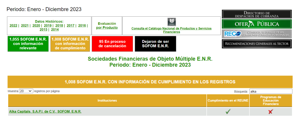 La información corresponde únicamente a Alka Capitals, S.A.P.I., de C.V., SOFOM, E.N.R., y para conocer la información de todo el sector al que le corresponde se podrá acceder al sitio http://www.buro.gob.mx